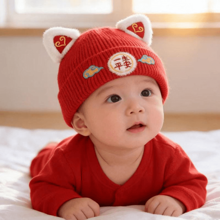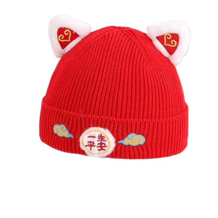 【中国直邮】 西坞 红色新年帽子婴幼儿宝宝针织毛线帽保暖防风金云一生平安2-12个月帽围40-46cm*1件