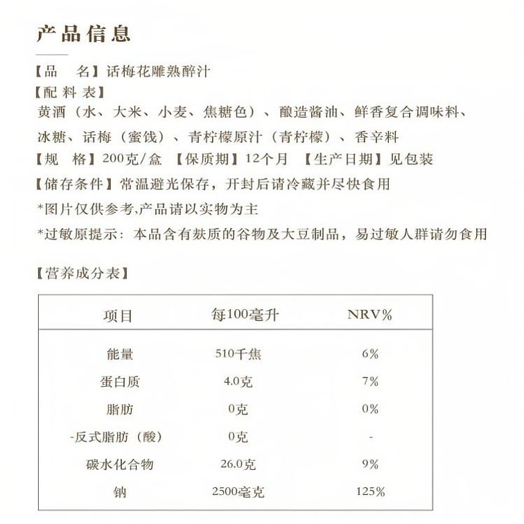 | 净含量 | 梅花雕熟醉捞汁200g |