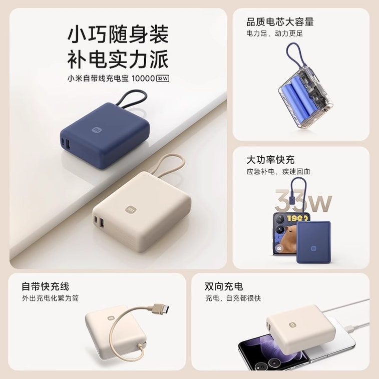 【中国直邮】 小米 自带线充电宝双向快充超大容量移动电源0.037kWh 浅咖色 1个装