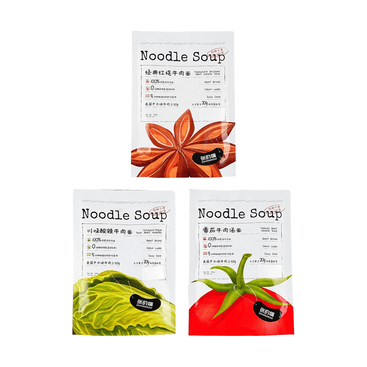 张的嘴 经典红烧牛肉面+川味酸辣牛肉面+番茄牛肉汤面 440g*3份【亚米独家】【3种口味组合装】【美国产大块牛肉≥50g】【100%纯原汤】【微波加热即食】