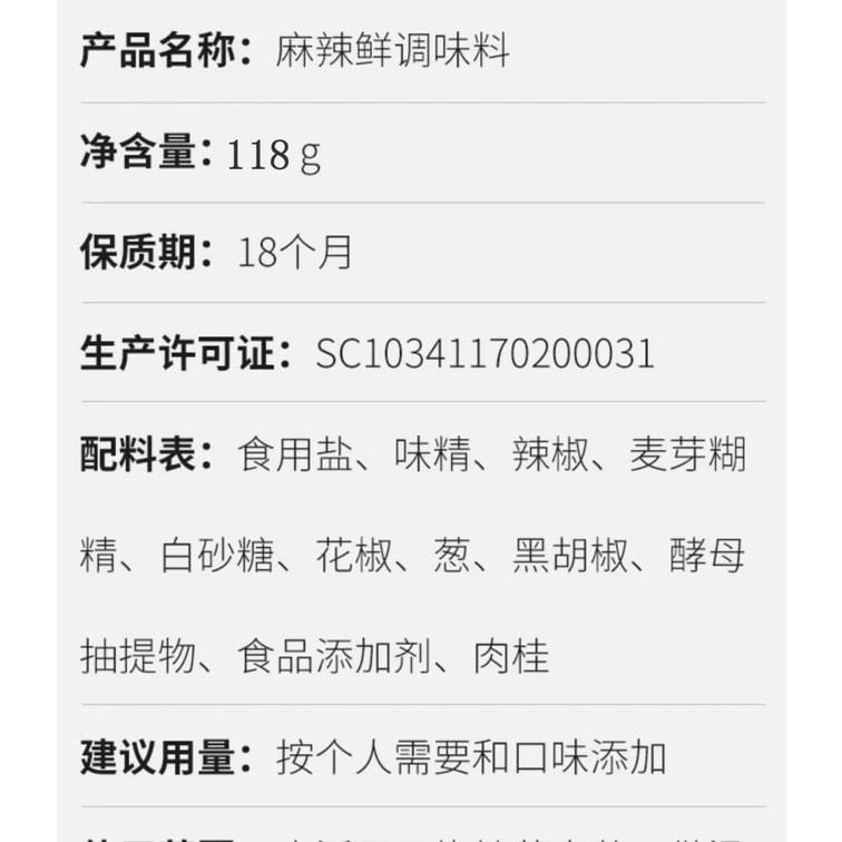 【中国直邮】 王守义 麻辣鲜调料118g*1袋