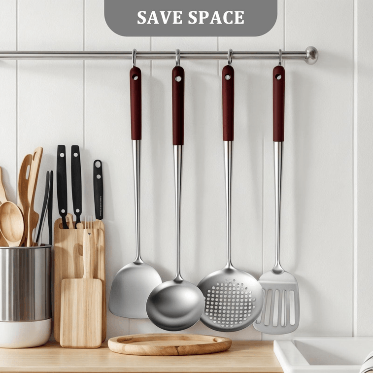 易于清洁和储存 - 这种炊具只需用肥皂和水即可轻松清洗,并且可用洗碗机清洗。手柄上有一个挂孔,方便将其挂在餐具挂钩上或抽屉中。