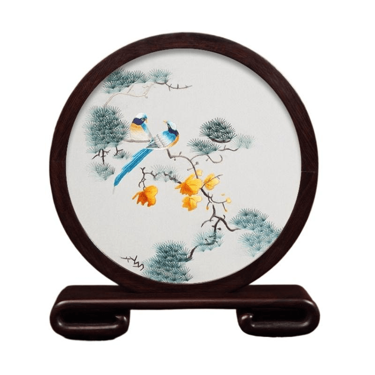【中国直邮】 全程锦绣 苏绣 手工真丝蚕线刺绣工艺品摆件 松枝花鸟 21.5*24*4.5cm | 亚米