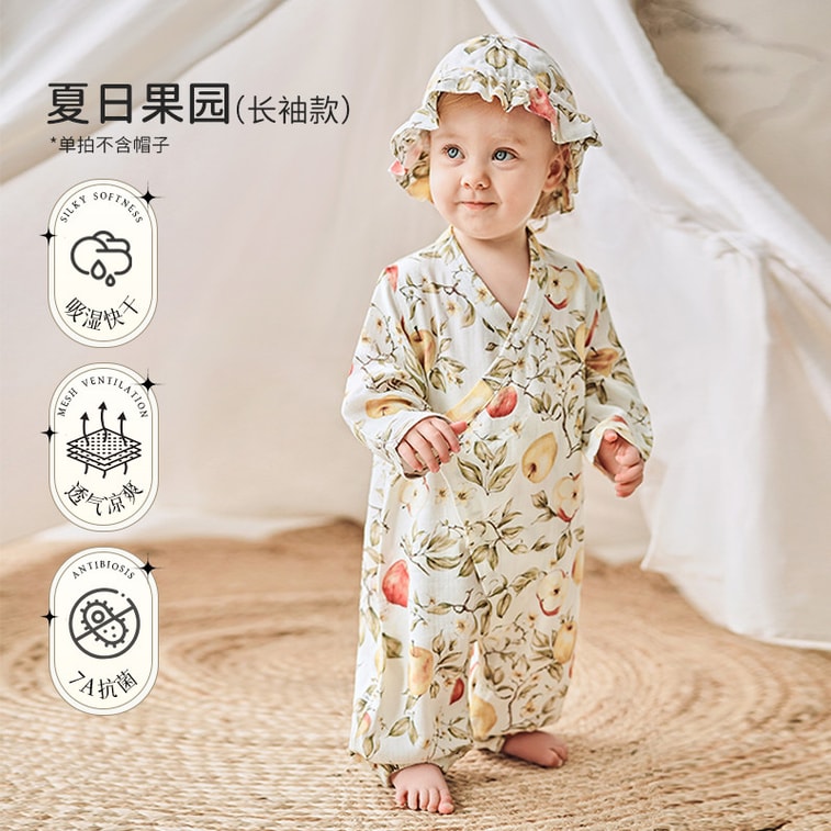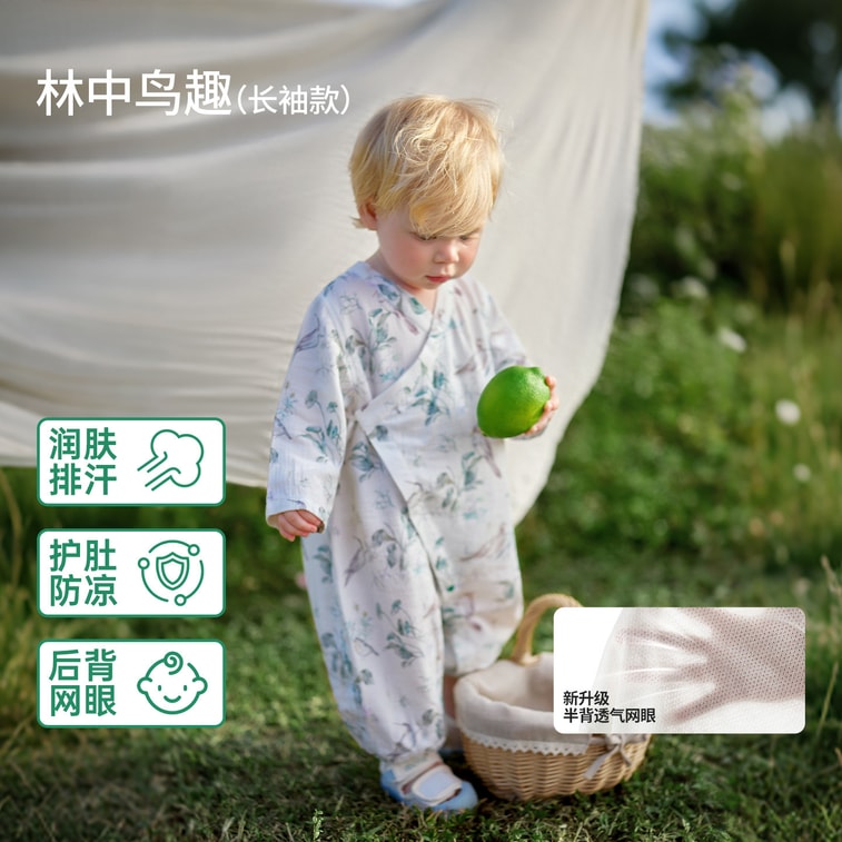 和尚服设计,穿脱护肚:斜襟系带 + 包屁剪裁,防风护肚防着凉;裆部全开扣,换尿布超方便,新手爸妈好操作