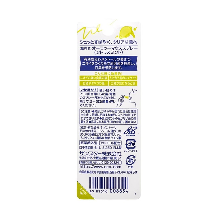 日本SUNSTAR ORA2 皓乐齿 口气清新剂 清香柑橘味 6ml 永野芽郁 姜梓新代言 【明星同款】