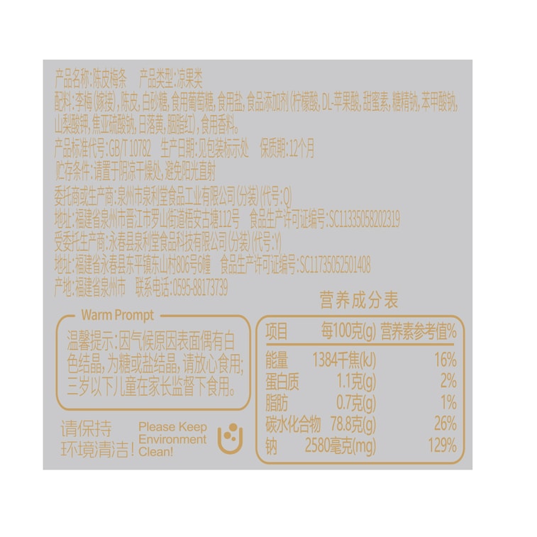 【中国直邮】 泉利堂 陈皮梅条 238克