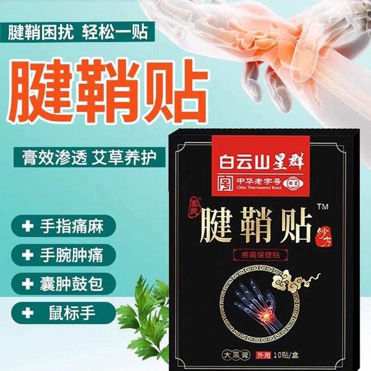 白云山星群蹇氏腱鞘贴,是专为鼠标手、腱鞘炎、手腕疼痛、拇指僵硬、长期劳损人群打造的疼痛护理好物,采用古法大黑膏草本配方,天然草本萃取,舒缓疼痛、活血化瘀、消肿散结,亲肤透气,10 贴独立盒装,便携耐用,是长期用电脑、手机、手工劳动者的腱鞘护理优选好物,轻松告别腱鞘疼痛、僵硬困扰。