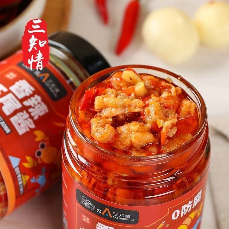 【中国直邮】 三知情 去壳香辣龙虾酱下饭菜拌饭特辣小龙虾酱蒜蓉酱拌面湖南即食虾零食 238g | 亚米