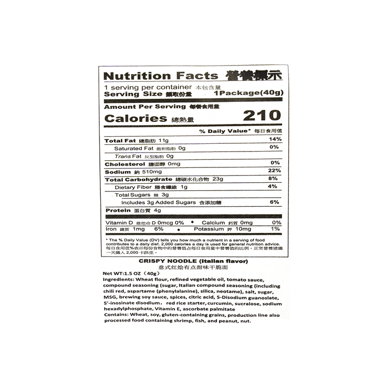 *免责声明:本页面所展示的营养成分信息来自商品包装,仅供参考。因包装版本、语言或拍摄方式不同,内容可能存在偏差或显示不完整,请以实际收到商品包装为准。如对成分、过敏原或适用人群有疑问,建议在使用前仔细阅读包装说明,或联系客服获取帮助。
