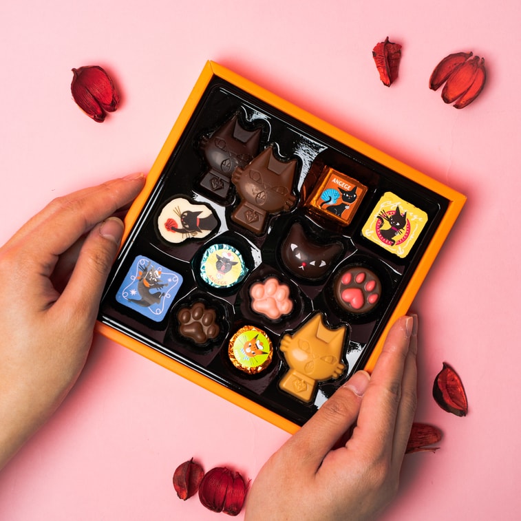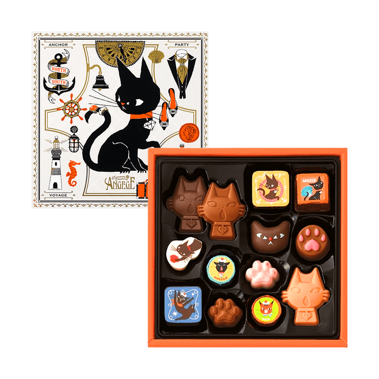 礼盒内包括: • 方形巧克力可可味*1、方形巧克力栗子味*1、猫咪扑球图案白巧*1、立体猫咪造型甘纳许巧克力*1、猫咪肉垫造型巧克力*1、方块甘纳许巧克力*1 • angege立体造型巧克力:甜味*1、牛奶味*1、草莓味*1 • 猫咪肉垫巧克力:牛奶味*1、猫草莓味*1 • 猫咪包装巧克力:甜味*1、牛奶*1
