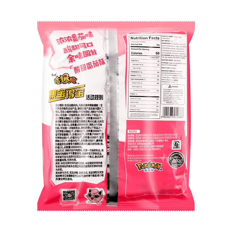【超值装】康师傅 方便面 香爆脆 干脆面 酸甜番茄味 33g*6包【宝可梦胖丁包装】