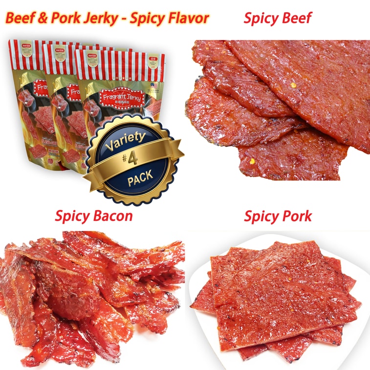 美国 新美香 现火烤辣味肉干 (辣味牛肉 4oz./辣味培根 4oz./辣味猪肉 4oz.) 3袋-总计12盎司 正宗新加坡风味肉干肉脯 340g