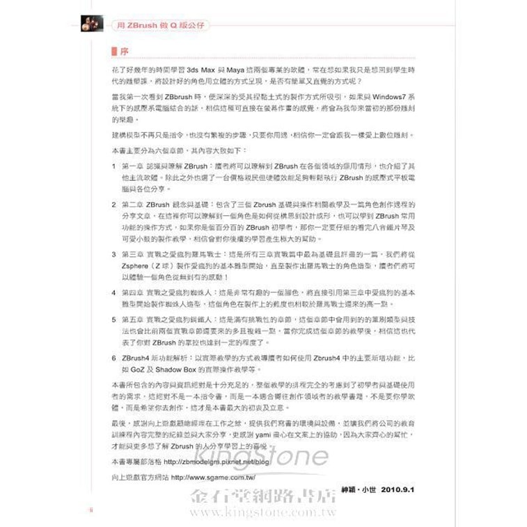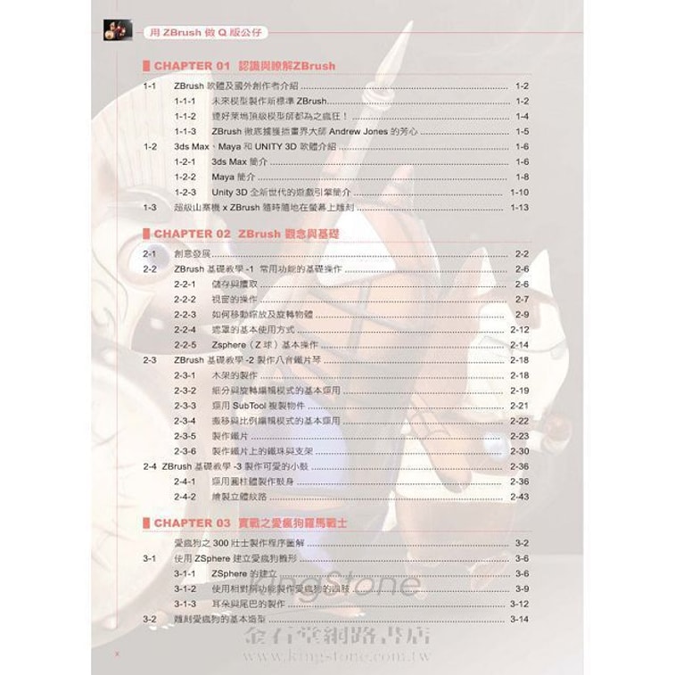 書中並針對ZBrush 4.0主要新增功能進行基礎教學與介紹,主要包含如何在3ds Max、Maya中設置連動Zbrush的GoZ設定及如何使用Shadow Box等新增功能的使用教學。