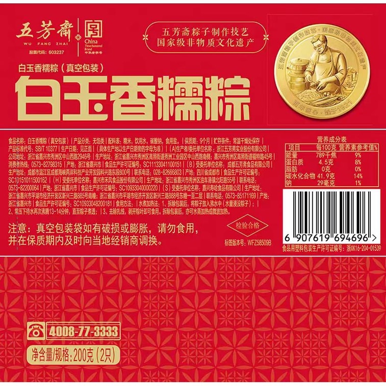 【中国直邮】 五芳斋 粽子 真空香糯粽 端午节日嘉兴送礼 100g*2只 | 亚米