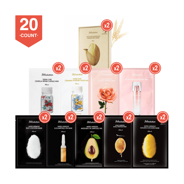 【JM面膜组合20片81折包邮】JM SOLUTION 安瓶面膜2片+牛油果面膜2片+黄金米面膜2片+蜂蜜面膜2片+玫瑰面膜2片+樱花面膜2片+蚕丝面膜2片+修复面膜2片+天丝氨基酸面膜2片+保湿面膜2片
