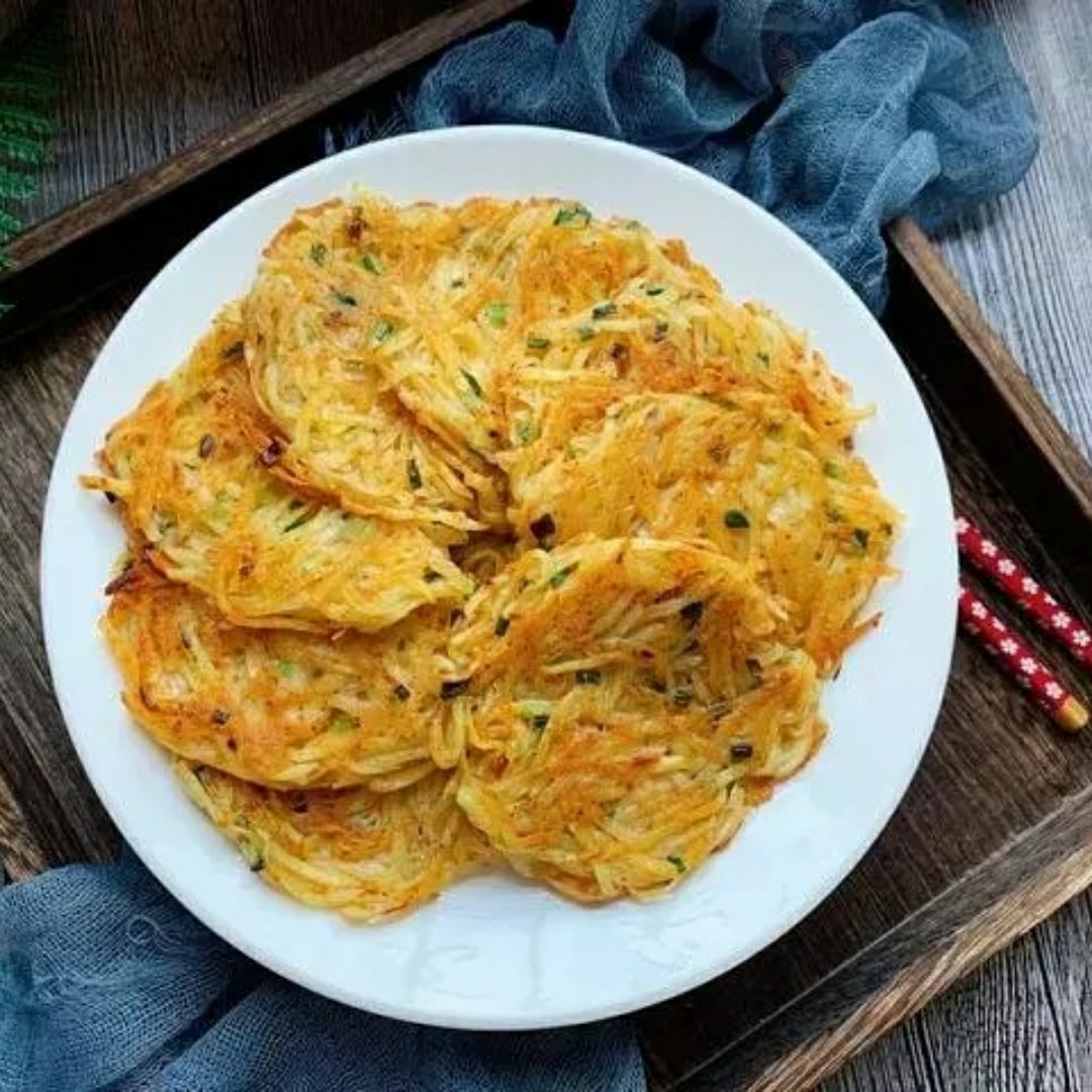 1.土豆去皮,擦成丝,然后用清水冲洗几遍,洗净控水。