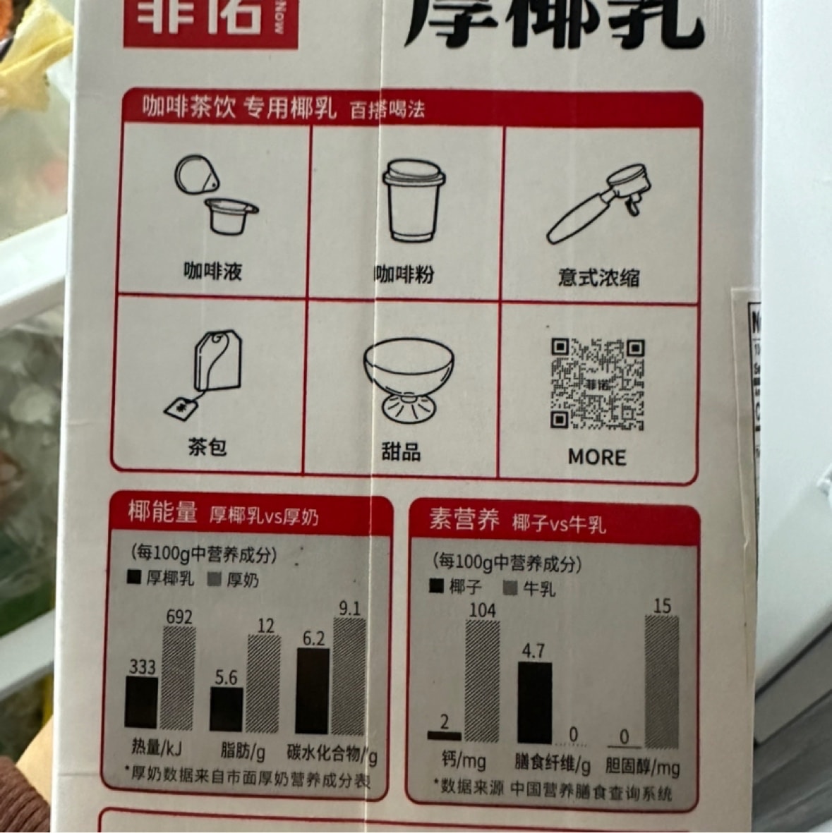 网红爆品厚椰乳,期望太高了难免失望,这个椰乳味道太弱了,还不如椰树椰汁,而且怎么咸咸的??甜味略有,做了一次椰乳拿铁也是味道诡异,毁掉我一杯香醇的意式浓缩…