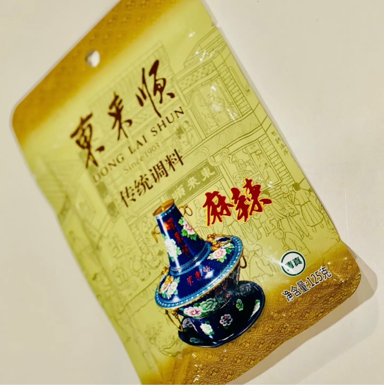 东来顺传统调料,麻辣味,净含量为一百二十五克,购入价 1.09 美元,热量是二百四十卡路里,保质期十二个月,于一九零三年建立的老品牌。