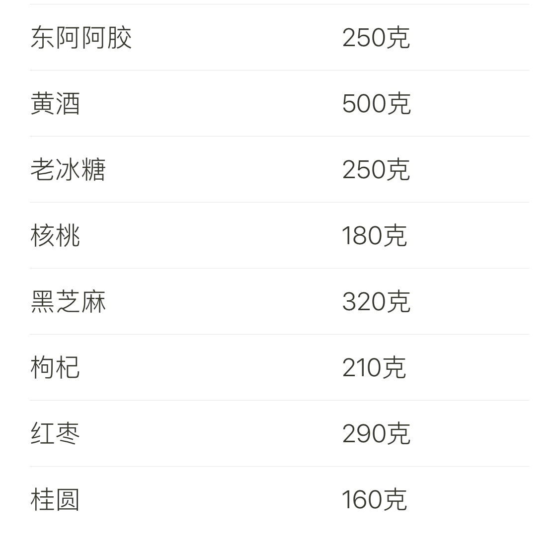 红枣、核桃、黑芝麻、枸杞、桂圆、老冰糖。