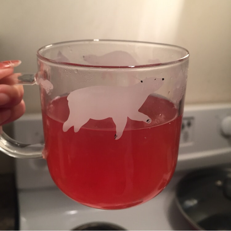根据苹果颜色的不同结果会不一样👇🏻下面第一张图就是一个皮比较红的苹果煮出来的 粉粉嫩嫩的 第二张是没那么红的苹果煮出来的 而且煮得比较久 有点点浑浊(大概是我按压了苹果块) 杯子里面还有苹果块 因为麻麻说煮完的苹果也要吃 不过不管苹果红不红煮完都是没啥颜色了