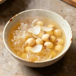 1.将干银耳冷水泡发后备用、莲子和百合温水浸泡