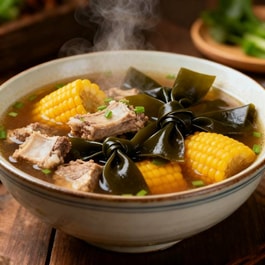 食材: 排骨400克、海带适量、玉米1根、香葱适量、生姜适量、食盐胡椒粉少许