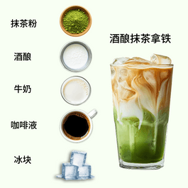 ➀用温水溶解5g抹茶粉 ➁杯中依次加入适量冰块、酒酿、牛奶 ➂沿杯壁缓缓倒入抹茶液形成渐变分层 ➃最后倒入咖啡液即可