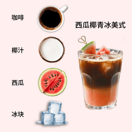 ➀将新鲜西瓜肉切成小块,放入杯中,用捣棒尽量压出汁水 ➁杯中加入冰块,倒入椰汁(也可混合少量椰乳,增加醇厚度) ➂将咖啡液沿着勺背缓慢倒入杯中,即可形成漂亮的分层