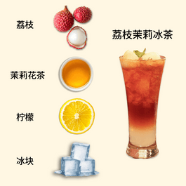 ➀杯中放入适量荔枝果肉,用捣棒轻轻捣压出汁水 ➁加入茉莉花茶+冰块雪克一下(可根据个人口味加入糖浆增加甜度) ➂最后点缀上柠檬片即可
