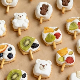 3.取出烤盘,适当压上蔬果干、饼干,重新送入烤箱150度烤5分钟即可