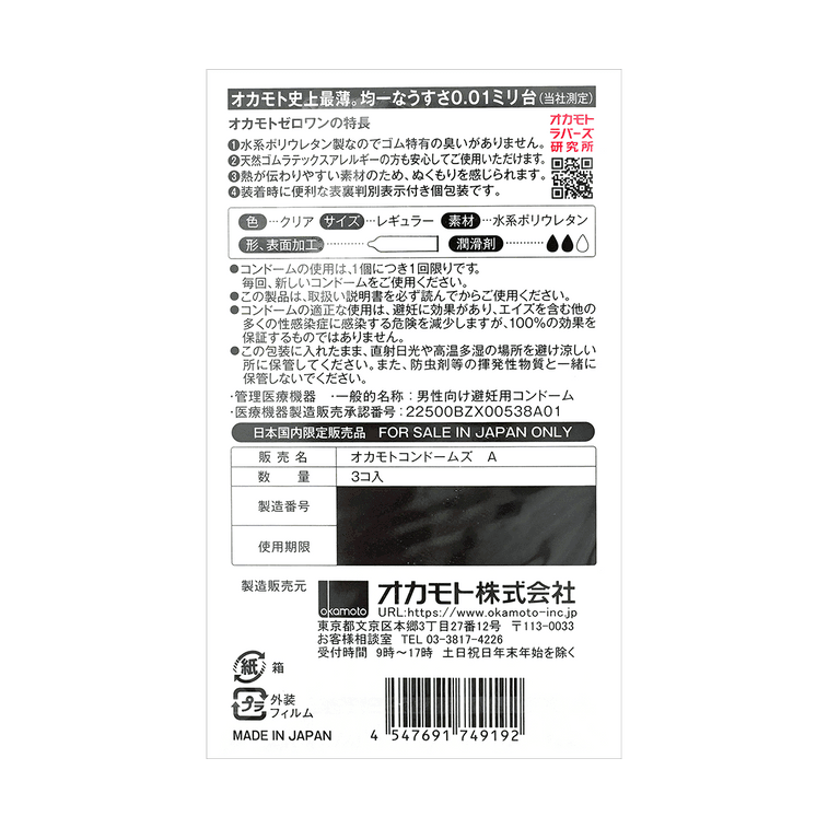 日本 OKAMOTO 岡本 001系列 抗敏聚氨酯 超薄保險套 3個入 非乳膠 日版