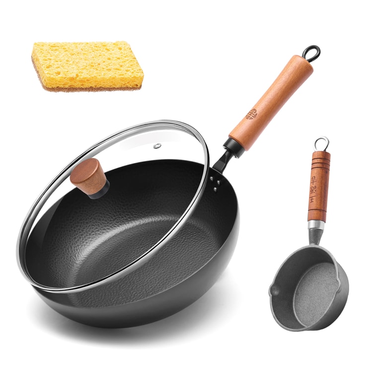 【鍛打煎鍋+11cm潑油小鍋 】王源吉 28cm煎鍋+熱油潑油小鐵鍋組合 無塗層 加厚款 不易沾鍋 所有爐灶通用