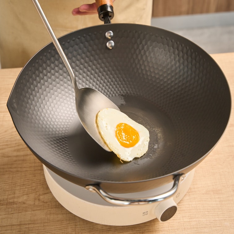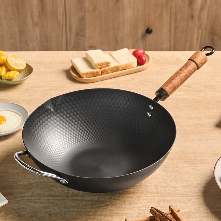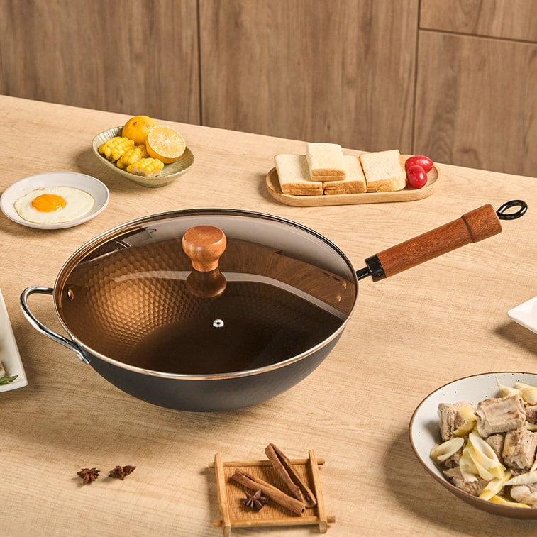 【鑽石紋理速熱防粘】大隆冶坊 子品牌 鑽石炒鍋32cm 蜂窩紋理 物理防粘 木製手柄帶附耳 帶玻璃蓋 - 有附耳 燃氣灶電磁爐通用 適合3-5人