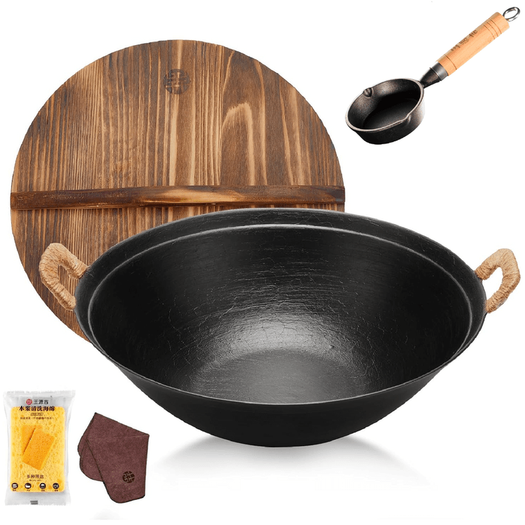 【李佳琦推薦 蘇鍋王+潑油小鍋13】 王源吉 鑄鐵蘇鍋 肚大鍋深 帶杉木蓋 手工古法 無塗層 物理不粘 平底鐵鍋 不挑爐灶 34cm (肚大鍋深 炒菜不溢出 )