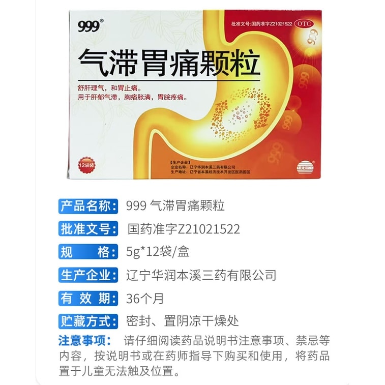 【中國直郵】 999 三九 氣滯胃痛顆粒 5gx 12小袋 | 亞米
