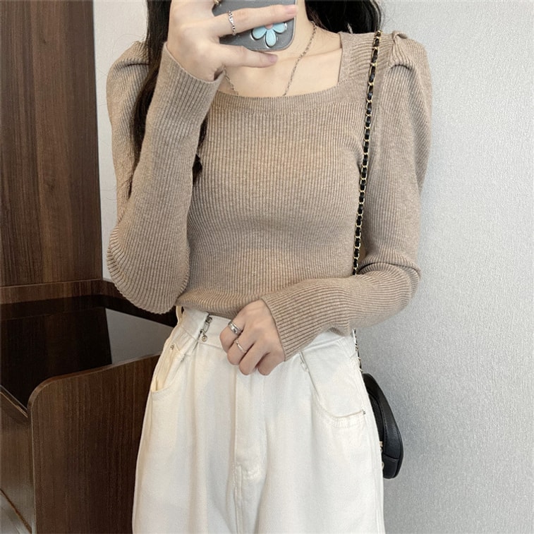 【中國直郵】茵如瀾 方領秋冬新款針織鎖骨低領泡泡袖打底衫 藍色