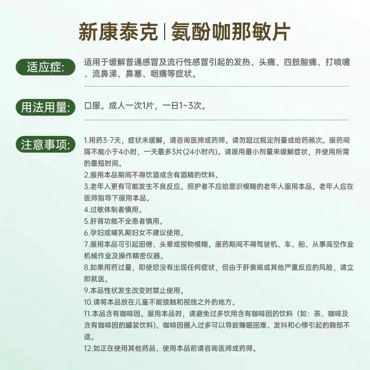 【中國直郵】 新康泰克 氨酚咖那敏片 流行性感冒發燒頭痛鼻塞流感甲流感冒藥 10片/盒(家中常備)