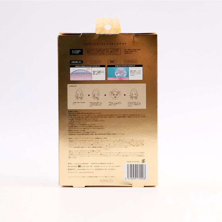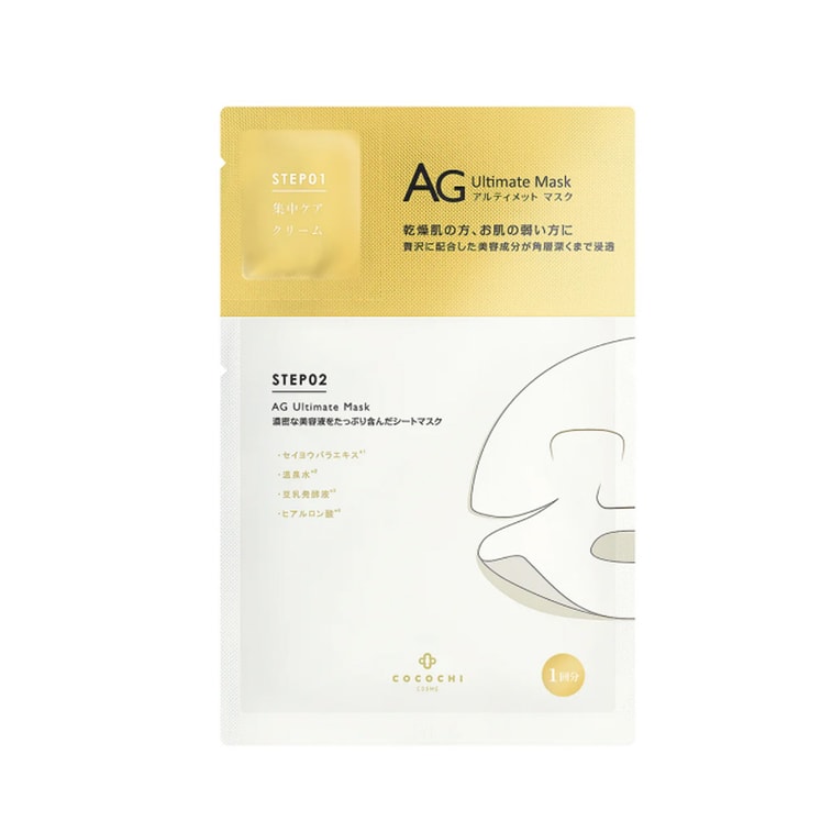 Product: COCOCHI AG Ultimate Mask Facial Essence Mask Gold 5 sheets Introduction: COCOCHI AG Ultimate Mask Facial Essence Mask Gold is a premium quality facial mask that is designed to provide deep hydration and nourishment to the skin. The mask is infused with a rich blend of ingredients that work together to rejuvenate the skin and restore its natural glow. Brand: COCOCHI Origin: COCOCHI AG Ultimate Mask Facial Essence Mask Gold is made in Japan. Description: This facial mask is made with a unique blend of ingredients that includes hyaluronic acid, collagen, and gold. These ingredients work together to provide deep hydration and nourishment to the skin, helping to reduce the appearance of fine lines and wrinkles, and leaving the skin looking smoother and more youthful. Characteristics: COCOCHI AG Ultimate Mask Facial Essence Mask Gold is known for its exceptional quality and effectiveness. The mask is made with high-quality ingredients that are carefully selected to provide maximum benefits to the skin. The gold in the mask helps to improve skin elasticity and firmness, while the hyaluronic acid and collagen work to hydrate and plump the skin, leaving it looking radiant and youthful. Usage methods: To use COCOCHI AG Ultimate Mask Facial Essence Mask Gold, first, cleanse your face thoroughly. Then, remove the mask from the packaging and unfold it. Apply the mask to your face, making sure it is evenly distributed. Leave the mask on for 15-20 minutes, then remove it and discard it. Gently massage any remaining essence into your skin until it is fully absorbed. Precautions: For external use only. Avoid contact with eyes. If contact occurs, rinse thoroughly with water. Stop using the mask if you experience any irritation or discomfort. Keep out of reach of children.