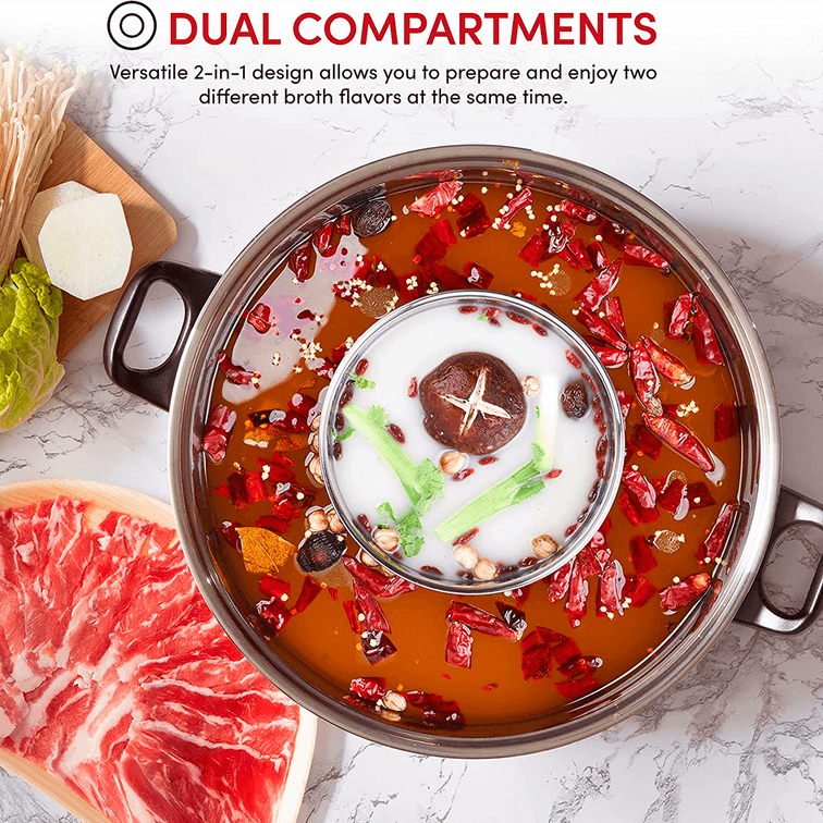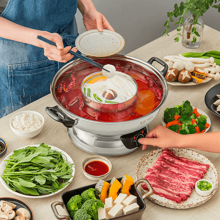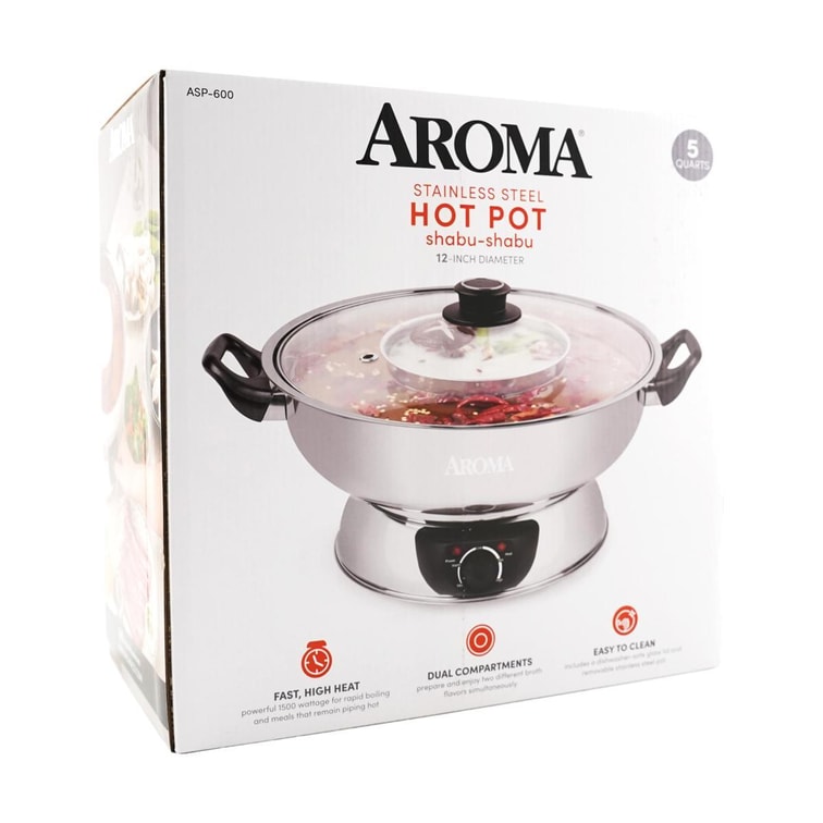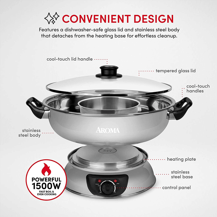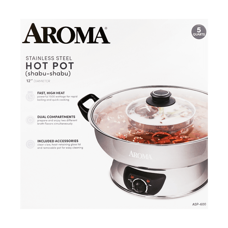 The Aroma Electric Shabu Shabu Hot Pot is the perfect way to enjoy a hot pot feast at home with family and friends. The two built-in compartments offer the convenience of two flavors in the same pot. Powerful at 1500 watts, it heats up broth fast and evenly. When it's time to cook your meat, seafood, and vegetables in the broth, the front power dial gives you easy access to adjusting temperature to the desired level. The stainless steel cooking pot is dishwasher safe, so cleanup is a breeze.
