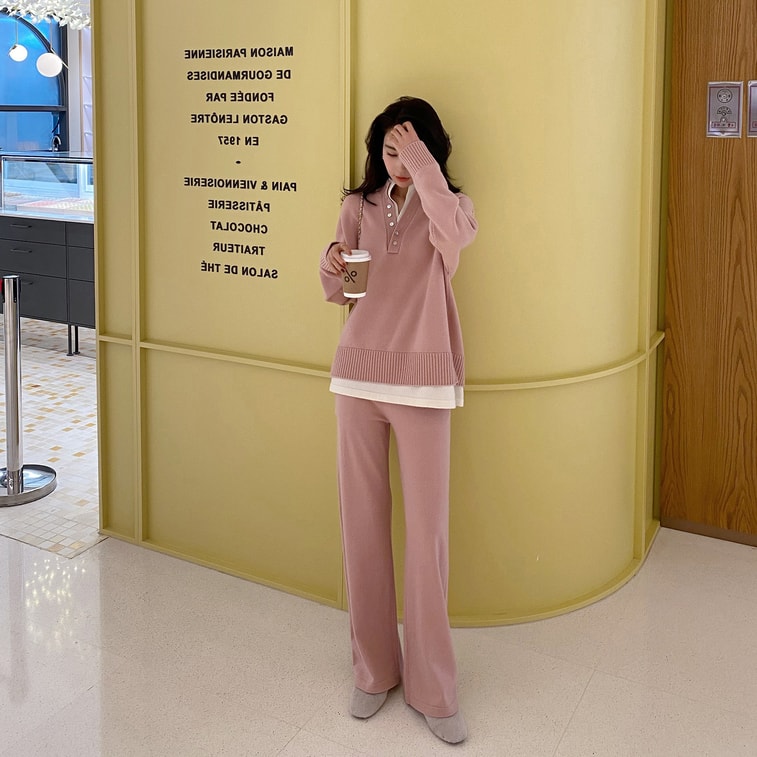 【中國直郵】 奢笛熊 秋冬時尚韓版小香風針織休閒風闊腿褲兩件套 粉紅色 均碼