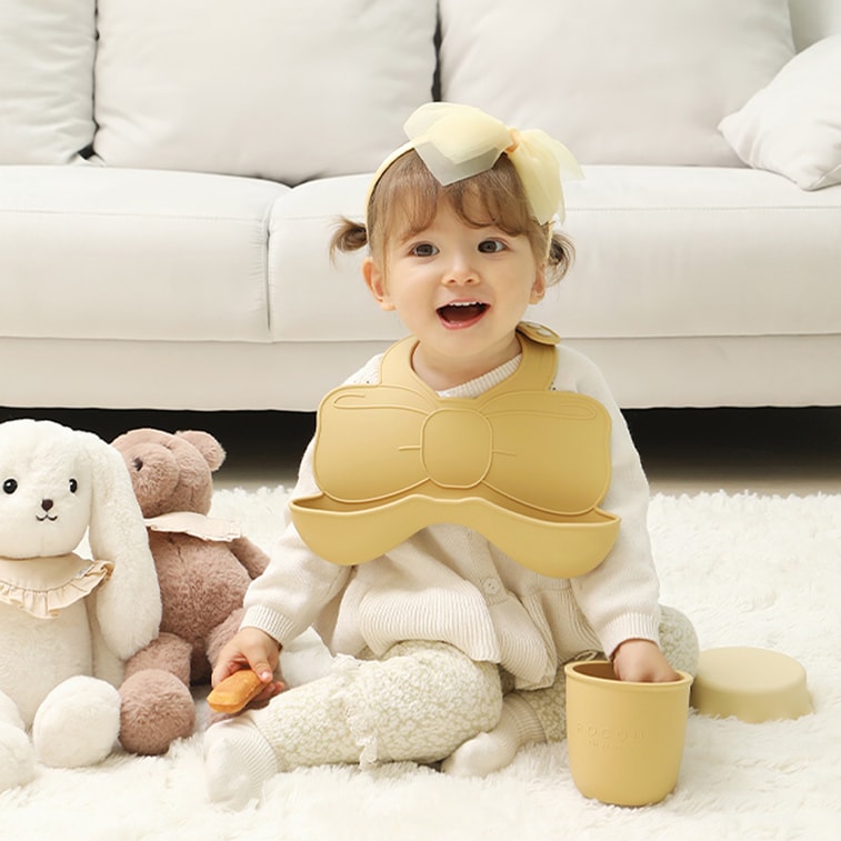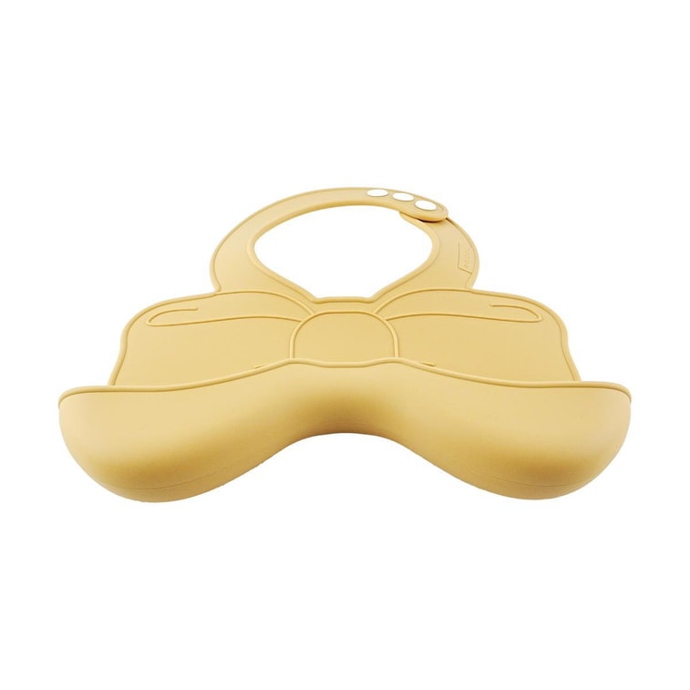 韓國ROCOU 嬰兒矽膠圍兜 蝴蝶結口水巾 寶寶吃飯圍兜 吃飯不髒神器 免洗可調節 蜂蜜黃