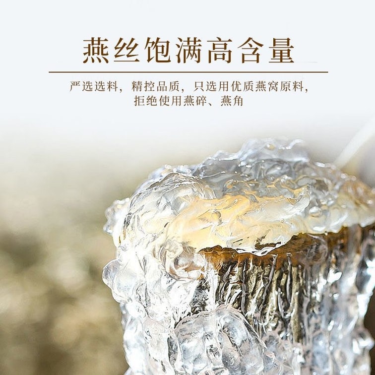 燕絲飽滿高含量 嚴選選料,精控品質,只選用優質燕窩原料,拒絕使用燕碎、燕角