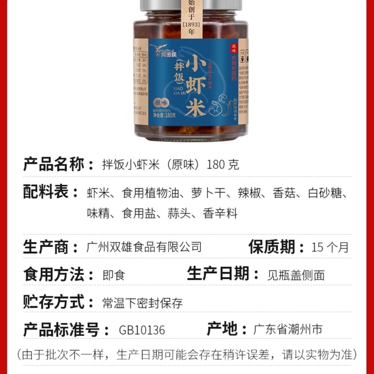 【中國直郵】 鷹金錢 拌飯小蝦米原味180g*1瓶