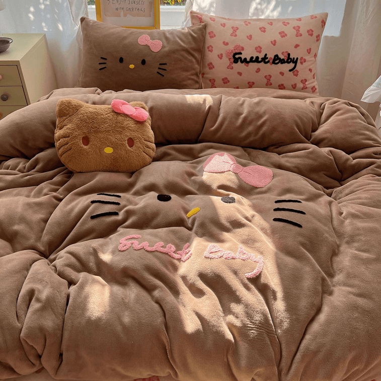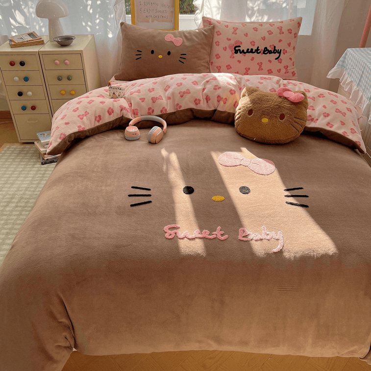 【中國直郵】 Lullabuy 黑皮貓貓牛奶絨床上三件套 床品被套枕套 咖色-Twin
