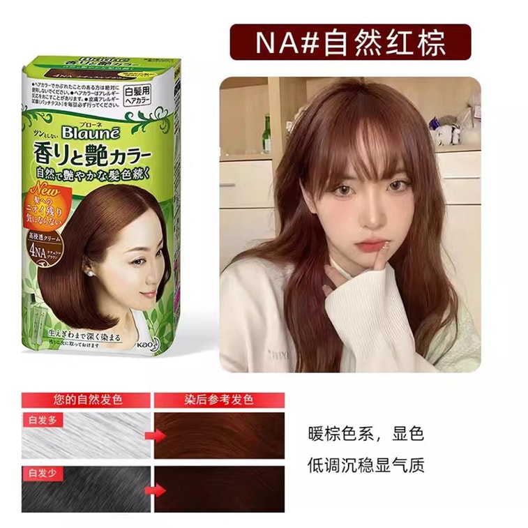 KAO Blaune Scented and Glossy Hair Color Cream is a hair coloring product that provides a long-lasting, vibrant color while also leaving your hair feeling glossy and scented. Brand and Origin: KAO is a Japanese personal care brand that has been in the industry for over 130 years. Their Blaune series of hair color products is well-known for its high quality and effectiveness. Description and Characteristics: The Blaune Scented and Glossy Hair Color Cream features a unique blend of ingredients that provide a gentle and nourishing coloring experience. The formula contains natural plant extracts that help to protect and nourish your hair during the coloring process. The product is available in several different shades, ranging from natural browns and blondes to more vibrant reds and purples. Usage Methods: To use the Blaune Scented and Glossy Hair Color Cream, start by mixing the color cream and developer together in a bowl. Apply the mixture to your hair, starting at the roots and working your way down to the tips. Leave the product in for the recommended amount of time, then rinse thoroughly with warm water. Precautions: Before using the product, it is important to perform a patch test to ensure that you are not allergic to any of the ingredients. It is also recommended to wear gloves during the application process to avoid staining your hands. Additionally, avoid getting the product in your eyes or mouth, and keep it out of reach of children.