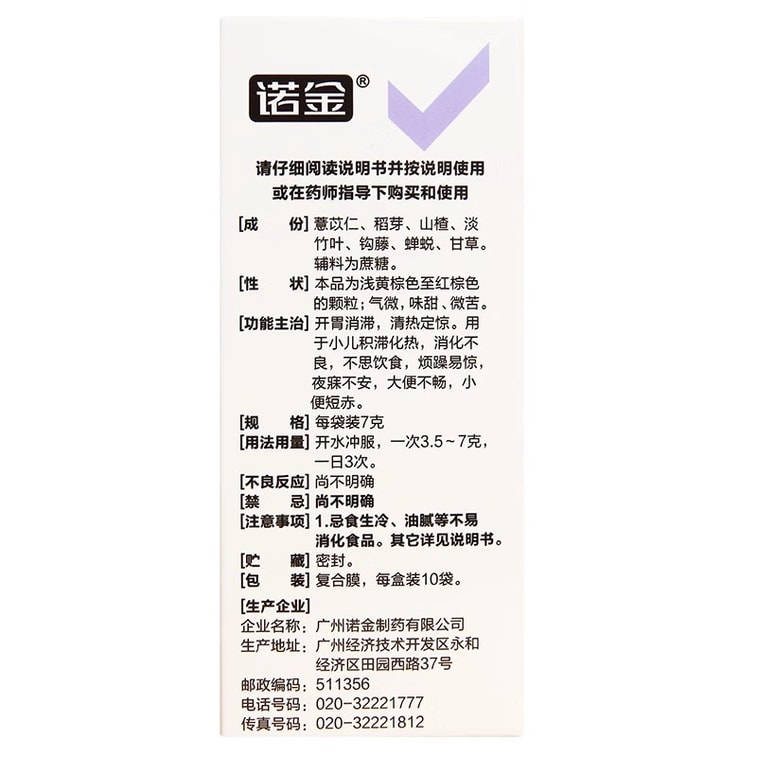 【中國直郵】 諾金 小兒七星茶顆粒 用於兒童食慾下降消化不良大便不暢 7g*10袋/盒