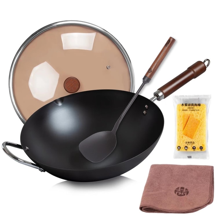 【爆炒鐵鍋+鍋鏟】王源吉 中餐炒菜鐵鍋 + 炒菜鐵鏟 櫸木長柄 無塗層炒鍋 6-8人餐 不挑爐灶 36cm