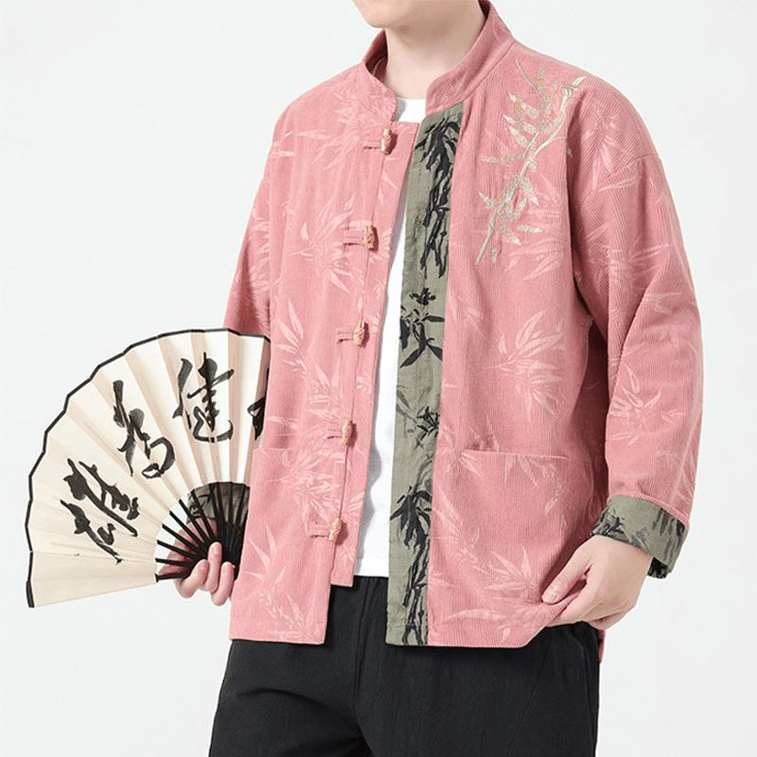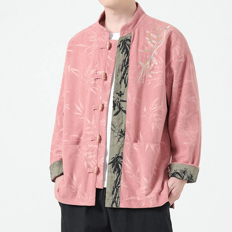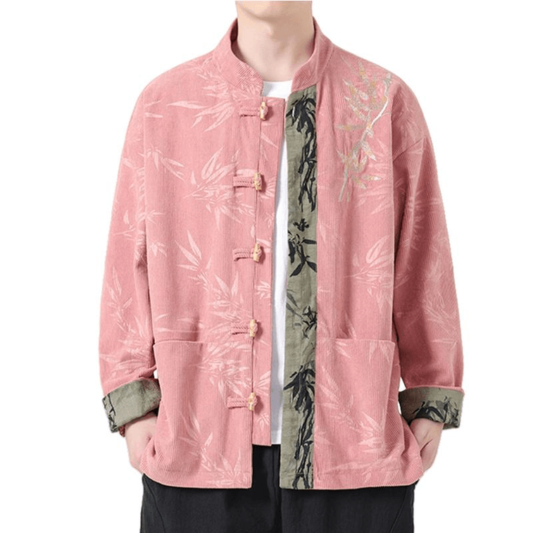 ASIS中國風燈芯絨復古刺繡拼接盤扣唐裝外套-粉紅色 XL