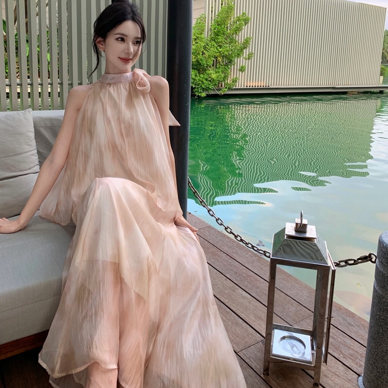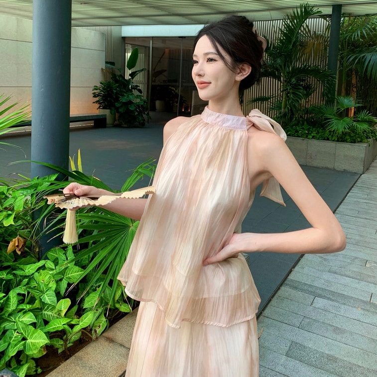 【中國直郵】 奢笛熊 新中式國風復古紮染油畫掛脖上衣 夏季高腰寬鬆半身裙 兩件套裝 M碼