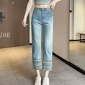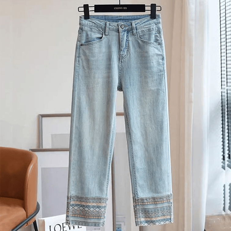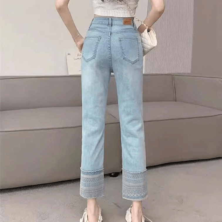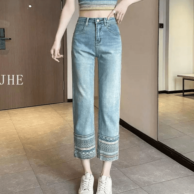 【中國直郵】 ASIS 風復古印花拼接九分牛仔褲直筒褲 2XL